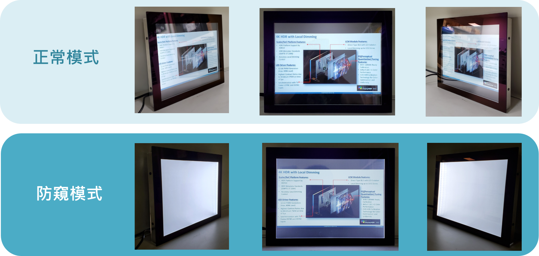 不同於一般市面上的防窺片技術,「可切換隱蔽螢幕模組 S-Privacy」可依據使用者在不同使用情境的隱私需求,切換螢幕視角的防窺顯示器,也可結合影像辨識感測器成為智能防窺顯示器,而且,在相同畫質與清晰度的條件下,「可切換隱蔽螢幕模組 S-Privacy」較市面現有的防窺片架構更節省20%以上的能源消耗。當設置在ATM上,藉由防窺模組調高顯示器兩側亮度,可遮蔽兩側視角內容,有效防阻不法人士從旁窺視交易內容。此外,控制切換方式可與設備控制介面整合,亦可外接感測器來控制,更不需要採用特規液晶面板即可實現其功能。